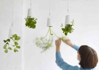 Une idée très moderne et originale de plantes suspendues cultivées à l’envers conçue par Patrick Morris. Ce sont des pots spéciaux qui nous permettent de faire pousser les graines à l’envers avec l’idée de conserver plus d’eau. Dans le fond de ces pots qui est inversé et reste en place, il y a une sorte de grille où les plantes sont arrosées. Tandis que dans la partie restante, il existe une sorte de couverture qui empêche la terre et la plante de tomber.